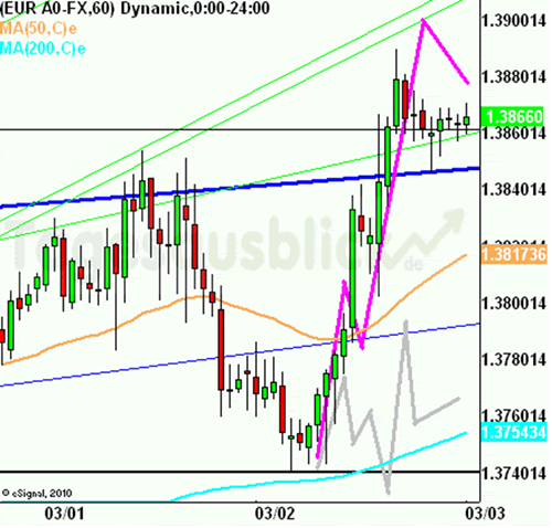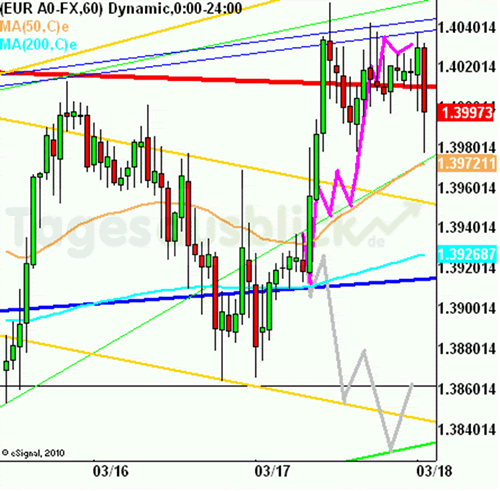Zitat: " Ob es heute über 1,40 USD steigt oder unter/auf 1,3862 / 1,3852 USD fällt wird sich in den ersten Handelsstunden entscheiden. Stundenschlusskurse unter dem EMA 50 Stundenbasis sprechen für das Alternativszenario."
