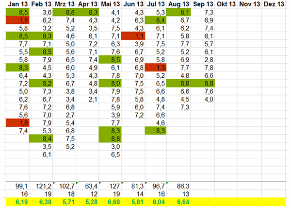 Excel Tabelle - Übersicht: Selbstbewertung aller EUR/USD - Tagesausblick - Analysen seit Beginn (2011)